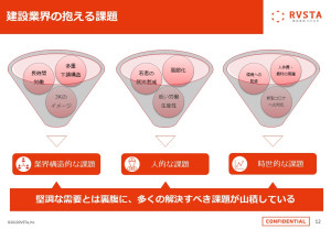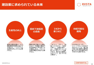 建設業界のデジタル技術導入が進んでおり、今後はさらに建設現場で利用されるITへの投資が加速し、将来的には数兆円ほどの市場に膨らむとリバスタでは考えています。